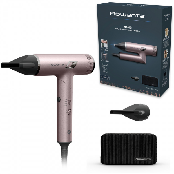 Rowenta Nano Fold nabízí vysokorychlostní sušení, ionizaci proti krepatění, 3 stupně nastavení a ultrakompaktní skládací design ideální na cesty.