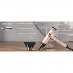 - Ionizační technologie redukuje statickou elektřinu a zajišťuje hladší strukturu vlasů s přirozeným leskem.