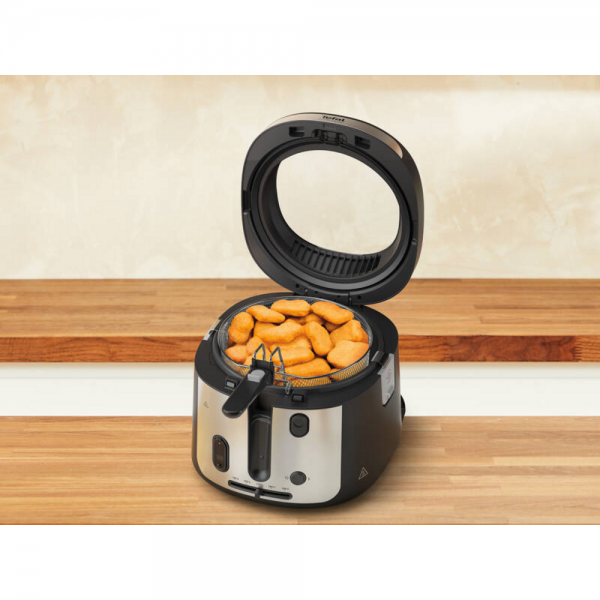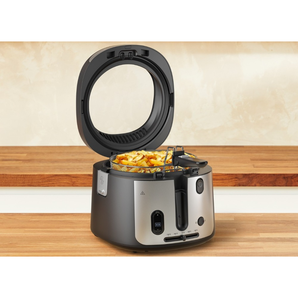 - Velké průhledné okénko umožňuje sledovat průběh smažení bez ztráty teploty uvnitř fritézy.