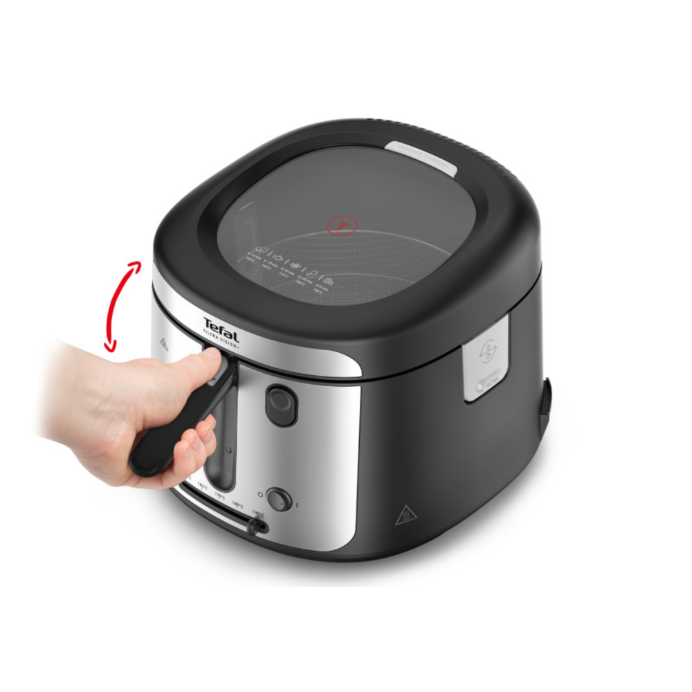 - Skládací rukojeť umožňuje bezpečné zvedání koše bez kontaktu s horkým olejem. Zároveň usnadňuje skladování přístroje v kuchyni.
