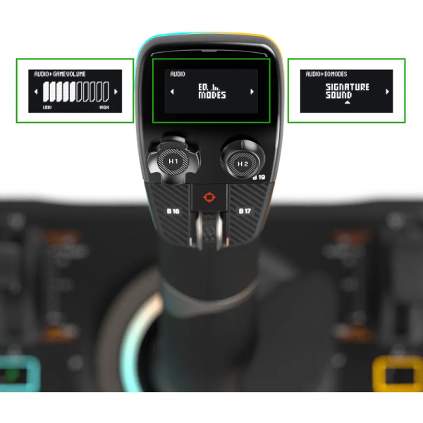 Integrovaný OLED displej poskytuje okamžitý přístup k letovým informacím, profilům a konfiguraci. Umožňuje rychle měnit režimy, upravit citlivost a optimalizovat ovládání podle právě hraného simulátoru.