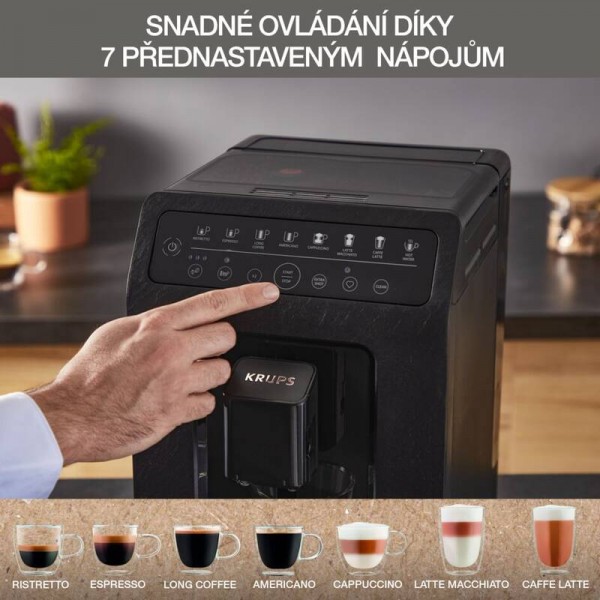Automatický kávovar Krups s vestavěným mlýnkem na kávová zrna s 5 stupni hrubosti namletí. Na jedno stisknutí připraví kávu podle vašich chutí. Najednou zvládne připravit až 2 šálky. 8 nápojů na výběr.