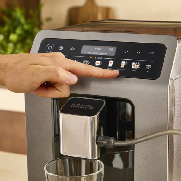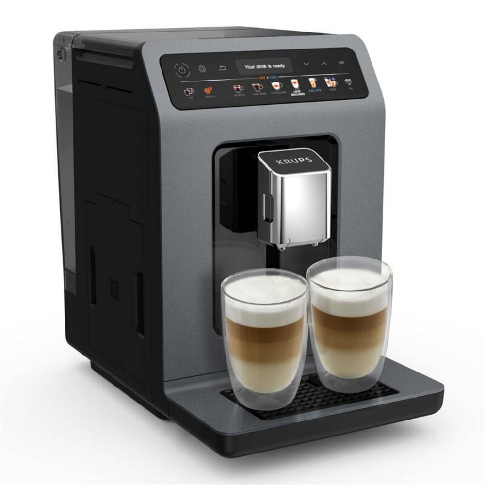 Automatický kávovar Krups EA898GF0 Evidence Hot & Cold – 15 bar, 1450 W, 18 nápojů včetně studených, One-Touch Cappuccino, mlýnek, 2,3 l nádržka, příprava 2 šálků, intuitivní displej.