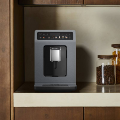 Kávovar v elegantním šedém provedení zapadne do každé kuchyně a nezabere mnoho místa. Díky kompaktním rozměrům je vhodný i do menších prostor. Tichý provoz zajišťuje nerušené používání i v ranních hodinách. Konstrukce z kvalitních materiálů garantuje dlouhou životnost a spolehlivost.
