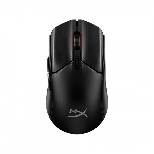 - Na obrázku je horní pohled na myš s čistým designem a logem HyperX. Tvar je optimalizovaný pro praváky, což zajišťuje pohodlné držení i při dlouhém hraní.