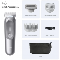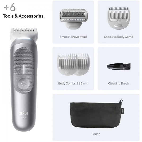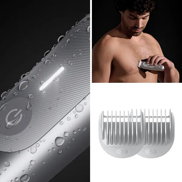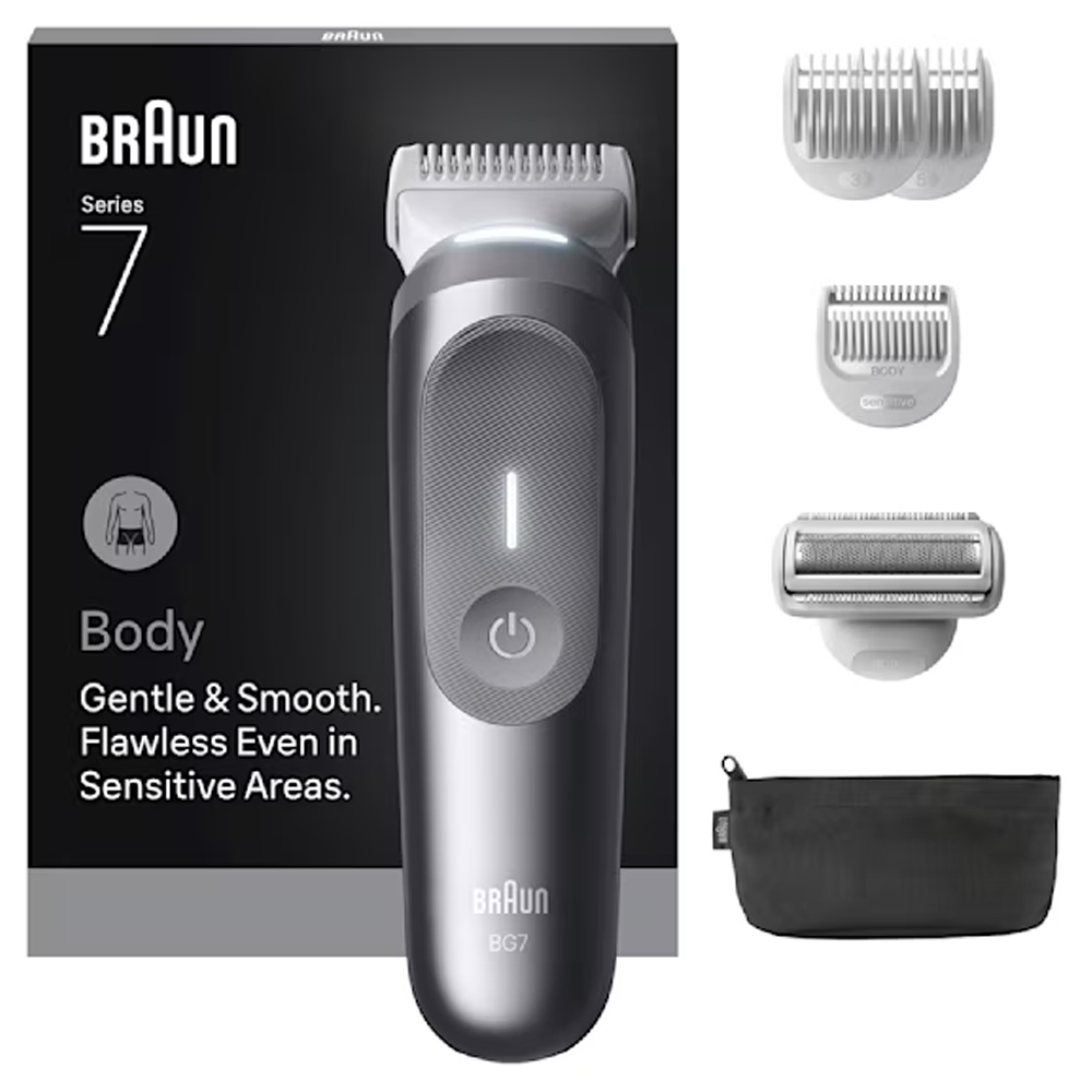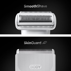 Braun BG7550 je prémiový tělový zastřihovač navržený pro bezpečné, přesné a pohodlné oholení celého těla. Kombinuje výkonný motor, inteligentní design a šetrné technologie, které umožňují upravit ochlupení na hrudi, zádech, podpaží i v citlivých oblastech bez podráždění pokožky. Inovativní čepel SkinShield zajišťuje hladké klouzání po pokožce a minimalizuje riziko pořezání i v oblastech s jemnou a citlivou pokožkou. Díky technologii AutoSense přístroj automaticky přizpůsobuje výkon hustotě chloupků a zajišťuje rovnoměrný výsledek v každé části těla. Osvětlení SmartLight vám pomůže zvýraznit i malé chloupky a osvětlí i hůře přístupná místa.