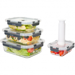Sada skleněných vakuovacích dóz pro uchování potravin déle čerstvých. Vakuovací pumpa v balení. 4 dózy s víky ve 4 velikostech. Tepelně odolné sklo vhodné i pro zapékání či mražení.