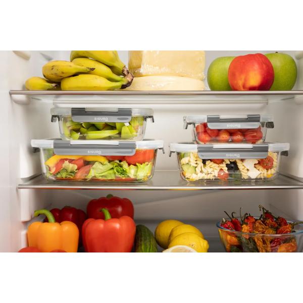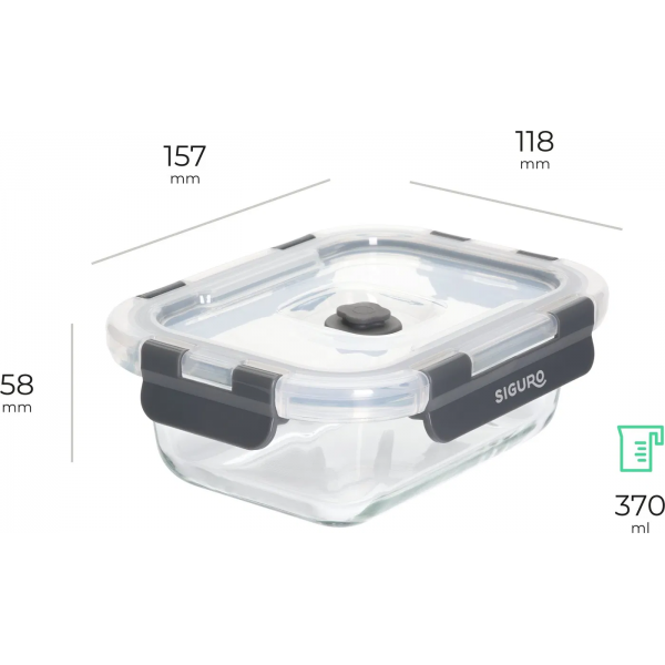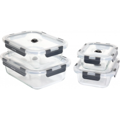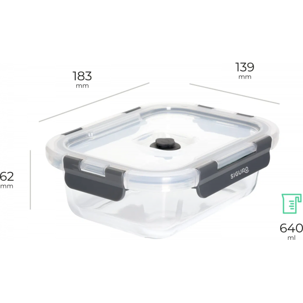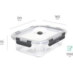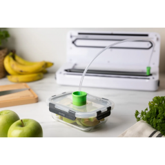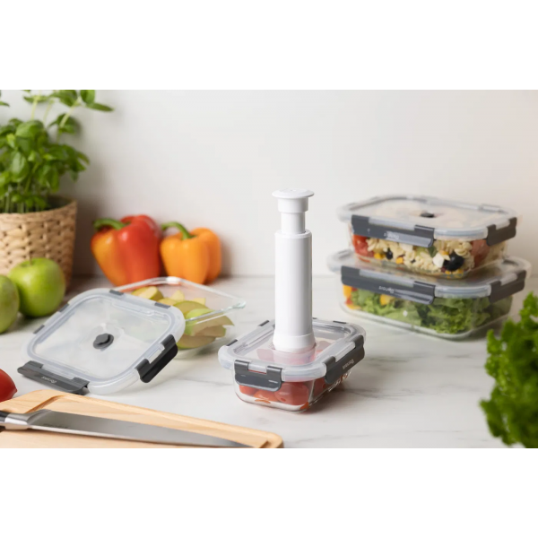 Vakuovací dózy vyrobené z borosilikátového skla a opatřené vzduchotěsným víkem využijete na skladování potravin, přenášení oběda nebo zapékání v troubě. Borosilikátové sklo je velmi odolné a zvládne teploty až do 500 °C. V dózách bez víka tak můžete pohodlně zapékat cokoli vás napadne. Pak stačí jen počkat, až jídlo vychladne, zacvaknout víko a sbalit si jídlo sebou do práce či na cesty. Plastová víka opatřená silikonovým těsněním zacvanete na dózu a zcela ji vzduchotěsně uzavřete. Vakuovacím otvorem ve středu víka je pak možné odsát přebytečný vzduch, čímž udržíte potraviny uvnitř déle čerstvé. Dózy i s víky je možné umístit i do mrazáku.