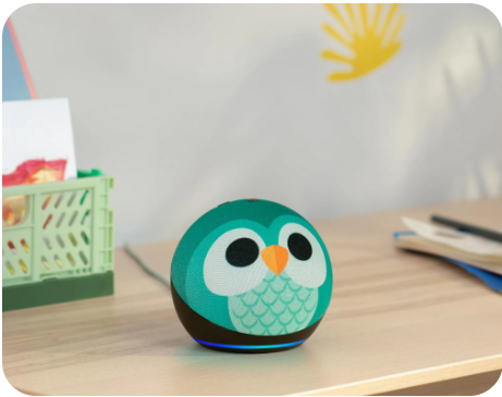 Amazon Echo Dot Kids (5. generace) v designu sovy je chytrý reproduktor s hlasovou asistentkou Alexa, navržený speciálně pro děti od 3 let. Nabízí bezpečný, zábavný a vzdělávací způsob, jak poslouchat hudbu, audioknihy, hrát hry nebo se učit nové věci pomocí hlasových příkazů. Díky přizpůsobeným odpovědím a rodičovské kontrole poskytuje obsah vhodný pro děti a umožňuje rodičům nastavit časové limity i filtrování obsahu.