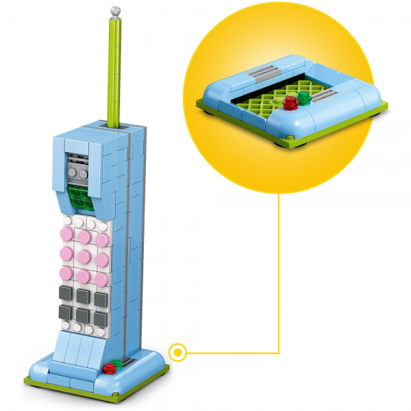 - Hlavní model představuje stylový retro telefon s otočným číselníkem a sluchátkem. Design v pastelových tónech podtrhuje nostalgický charakter stavebnice.