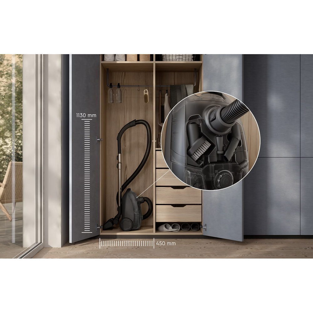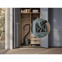 - Kompaktní konstrukce umožňuje uložit vysavač i do menších prostor, například do skříně.