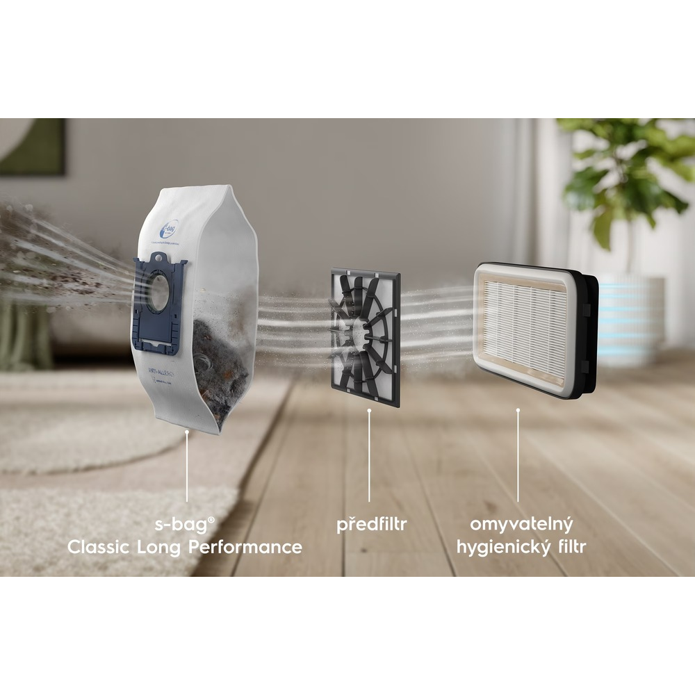 - Sáček S-bag spolu s předfiltrem a omyvatelným hygienickým filtrem zachytí jemný prach i alergeny.
